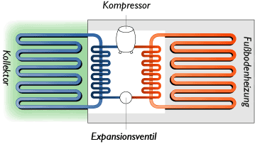 Die Energieaufnahme in den Kollektoren und der Energietransport findet mit Hilfe von mit Glykol (Frostschutzmittel) versetztem Wasser statt. Das Wasser transportiert die Wärme zur Wärmepumpe, die die Energie in Heizwärme umwandelt.