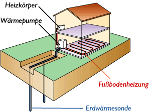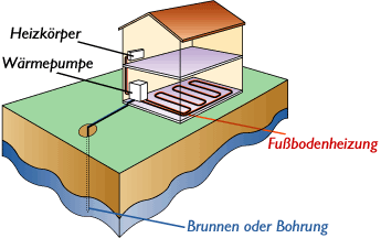Die im Grundwasser enthaltene Energie kann mit Hilfe einer Pumpanlage (Bohrung oder Brunnen) nutzbar gemacht werden. Diese Lösung bietet sich an, wenn in direkter Nähe Grundwasser vorhanden ist.